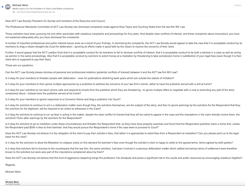 A number of important professional and public interest issues arise as a result of the findings. In dismissing the complaints, the ACT Law Society would appear to take the view that it is acceptable conduct by its members to drag a citizen straight into Court for defamation – ignoring all efforts made in good faith by the citizen to resolve the concerns of their client.