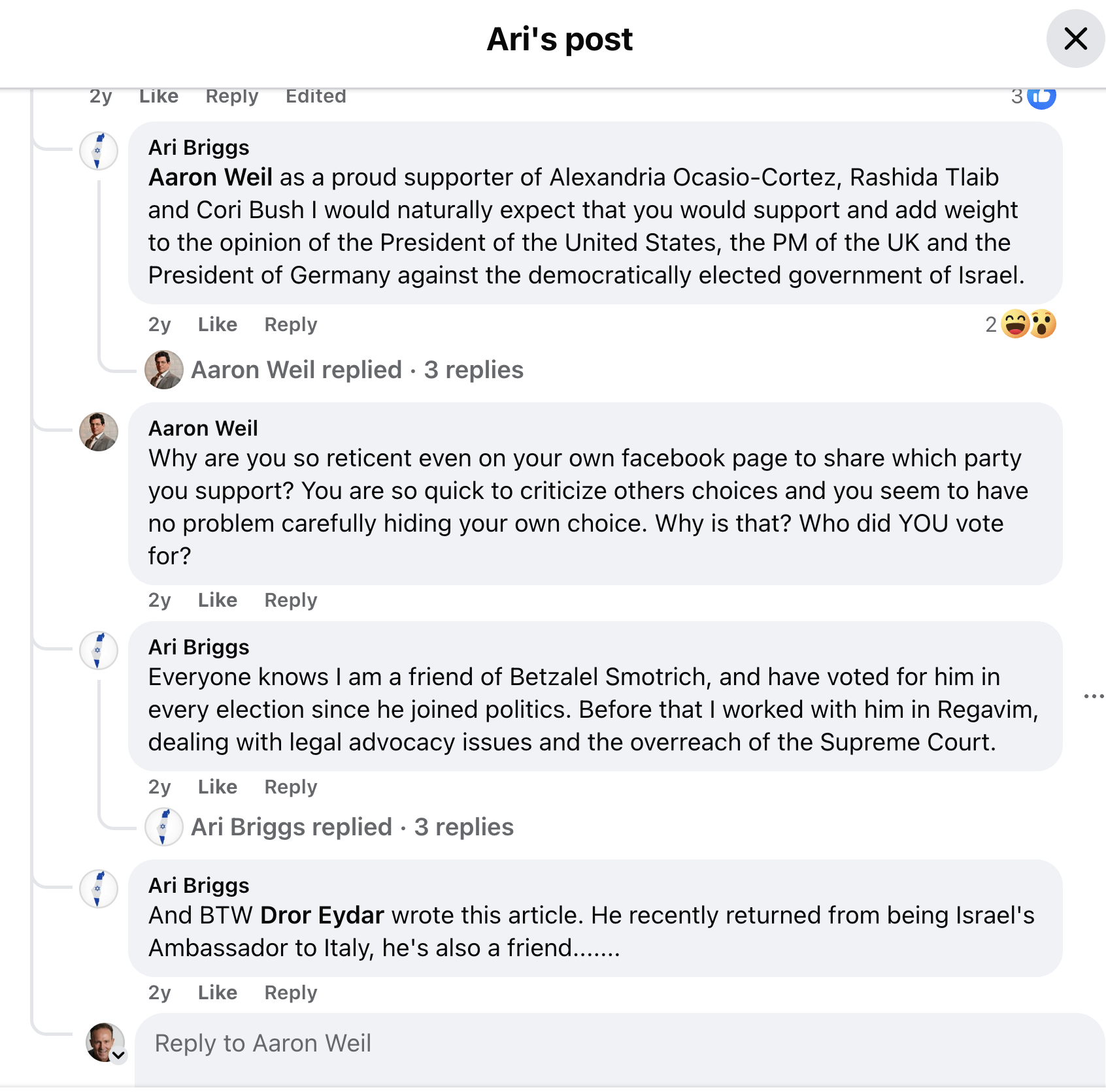 Briggs is also director of Regavim, a pro-settler organisation that has campaigned against Palestinian communities in the West Bank. Regavim was founded in 2006 by Yehuda Eliahu and Bezalel Smotrich as “response to a September 2005 Supreme Court case brought by Peace Now against the illegal outpost of Harasha in Samaria.”