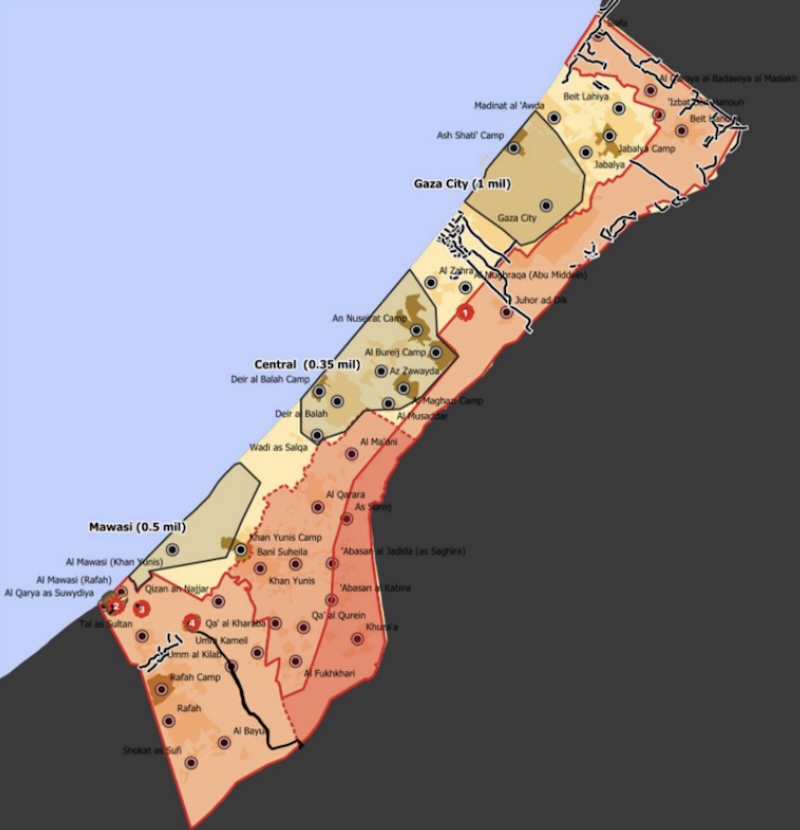 The red circles show the locations of GHF’s 5 sites. The sites are separated from Israeli forces’ designated safe zones for Palestinian civilians in Mawasi, Central Gaza, and Gaza City. Source: Harvard Dataverse; Garb (2025)
