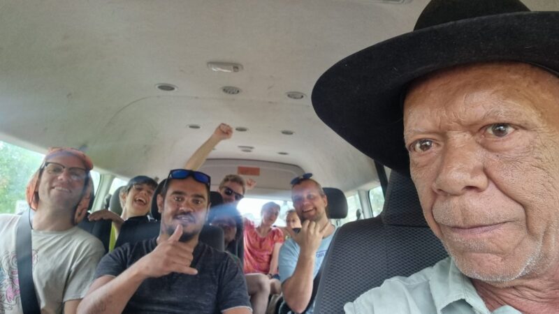 There are six CAFFA members making the journey in a minibus, and three Traditional Owners from throughout the region will join us along the way to Darwin. We only have two CDs – a mix of old country songs and Bunna Lawrie’s Best of Coloured Stone – and with no reception for streaming and very few radio stations between Alice and Darwin, they’re put on heavy rotation.