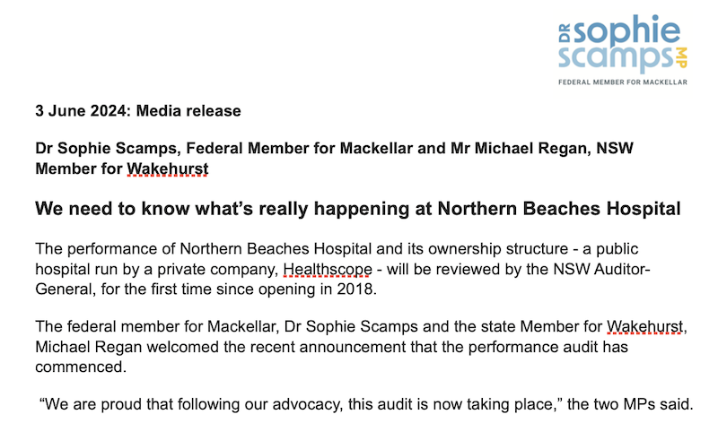 Two independent politicians, Sophie Scamps and Michael Regan, have announced an inquiry into the privatised Northern Beaches Hospital. What’s the scam?