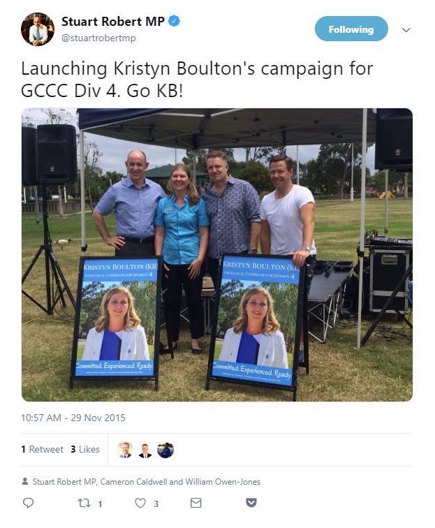 Robert told the CCC he did not speak to Cr Boulton and Stevenson during the campaigns but social media postings reveal he was involved with launching Cr Boulton’s campaign. Robert said he earlier told the pair he was going to seek funding for their campaigns from the Fadden Forum and that they would have known what the Fadden Forum’s business was.