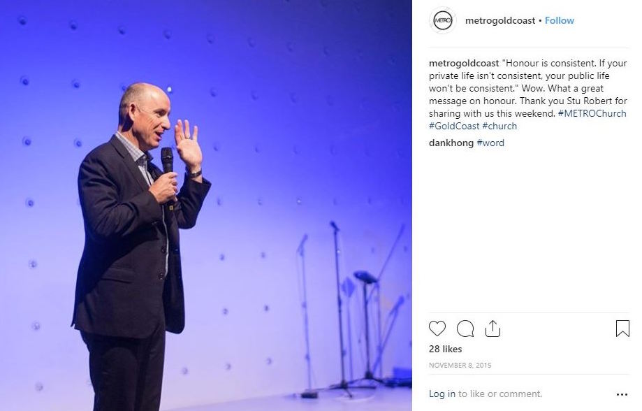 Robert’s wife Chantelle is a pastor at the Metro Church on the Gold Coast and the church’s website advertises Stuart and Chantelle as hosts of a $5600 per person trip to Israel scheduled for next year.