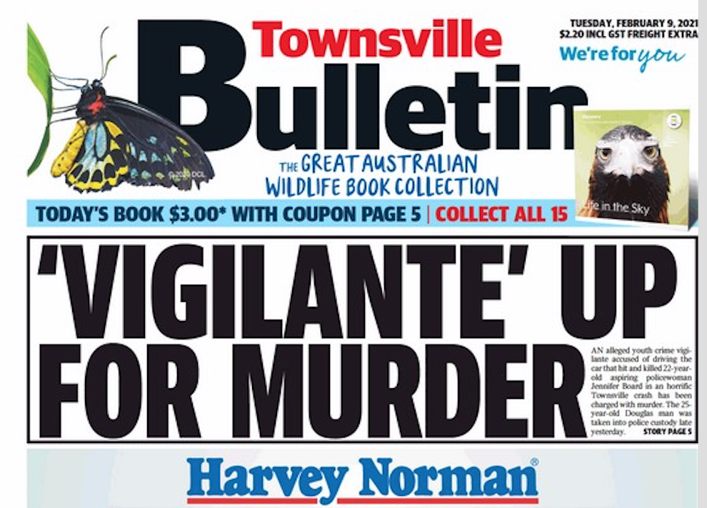This is what happened in Townsville on February 5th, as a 22-year old woman was riding her motorbike and was hit by the vigilante’s car. Not only did The Townsville Bulletin splash the story over the one quarter of the front-page usually reserved for actual news, but the newspaper continued to milk it for all it was worth, feeding the oft-repeated narrative that Queensland politicians are “soft on crime”.