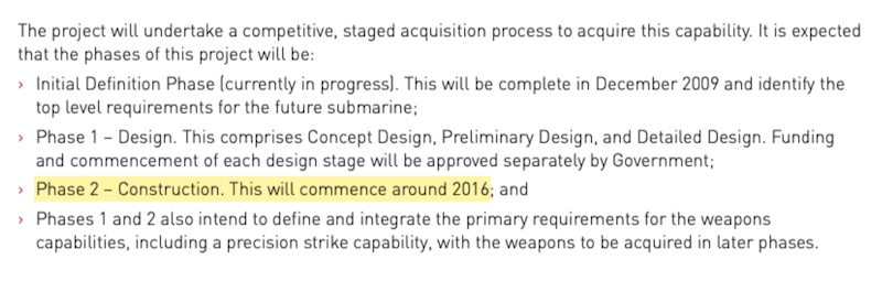 Sensibly, the future submarine project was first stood up in 2009. The plan was to work through the purchase options and commence construction of the first futures submarine in 2016, with the first boat hitting the water well before 2025, when the first of the ageing Collins Class submarines was due to retire.