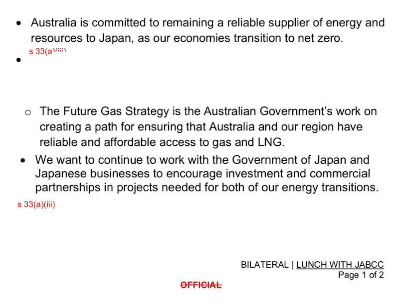 While Bowen was out there creating the impression Labor was serious about addressing climate change, a new FOI release reveals Resource Minister Madeleine King was in north Asia mixing with the who’s who of the gas and energy Industry in Tokyo and Seoul, advertising ‘Australia’s open for fossil fuel business’.