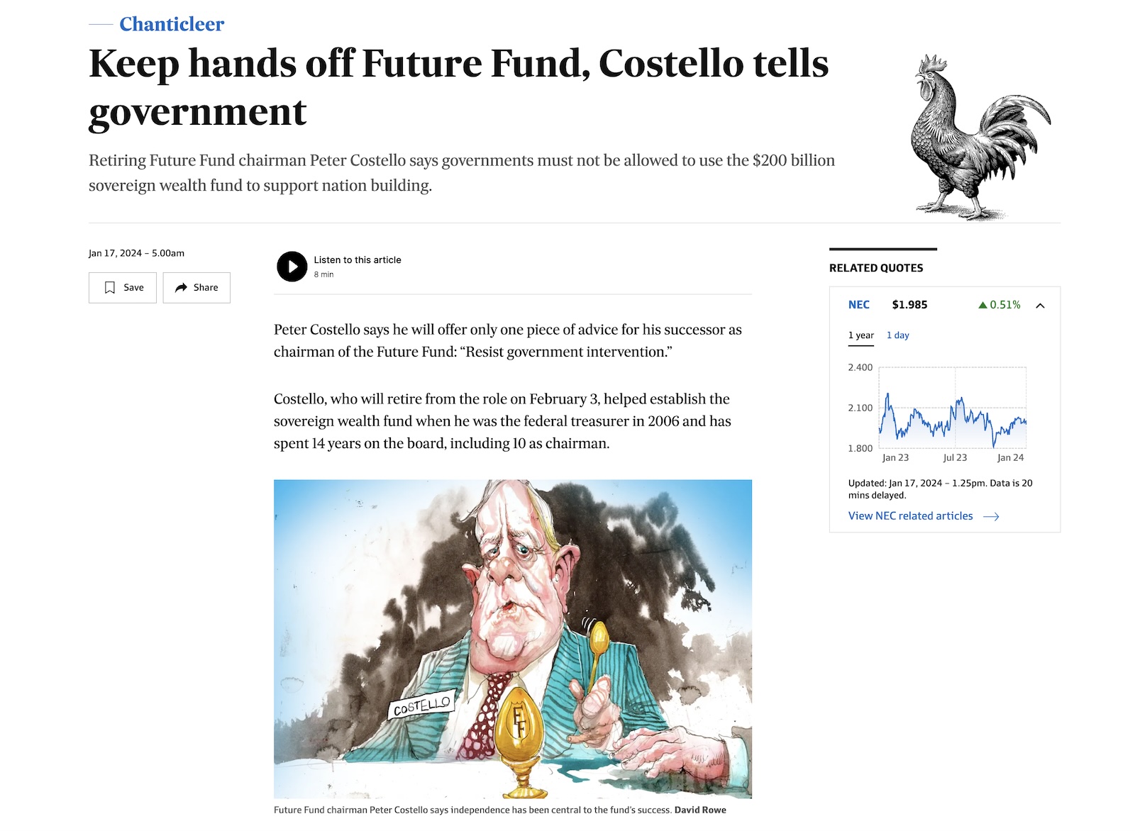 Chanticleer’s interview with retiring Future Fund Chairman Peter Costello – “Keep your hands off the Future Fund” – highlighted why Treasurer Jim Chalmers needs to review the Funds purpose as a matter of urgency.
