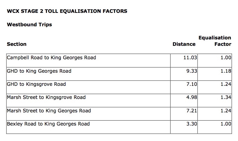 Ian Bell discovered the mysterious term “Equalisation Factor” buried in the schedules to the M5 Concession Deed. “It appears they are, in effect, lengthening the distance of the toll road,” says Bell. “So, you multiply the distance by the “Equalisation Factor” to get the per-distance toll price. You still have to pay a flag-fall but the distance element of the toll … it appears there is an uplift of 18 per cent to 36 per cent”.