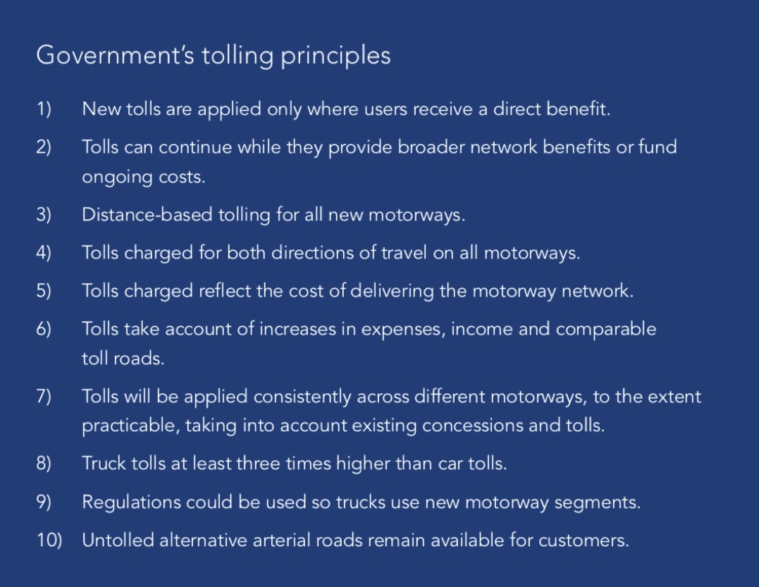 According to state policy on tolling (see Principle #3), there will be “Distance based tolling for all new motorways”.