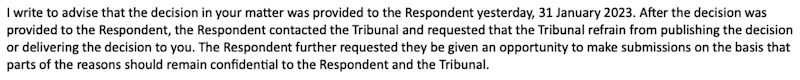 The AAT handed down its decision on Tuesday. Rex was not made aware of it until late Wednesday when the Tribunal wrote to him and advised him that the decision had only been sent to the Government, and the Government were objecting to the decision being released in full.