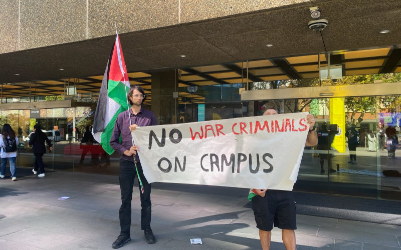 Escorted by UTS security, three SWU representatives arrived. A small group was admitted. Soon afterwards, the participants could be seen from below in the building’s meeting room. A few protesters remained and booed the attendees as they left. These included Mark Leach, a far right Christian Zionist and founder of pro-Israeli group Never Again is Now. Later on X, he condemned the protesters and described Israel as a “multi-ethnic enclave of civilisation.”