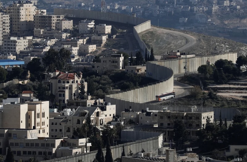 The Israeli wall separating the Jewish-only settlements in the Jerusalem District (left) from Abu Dis in the Jerusalem Governorate of Palestine (right).