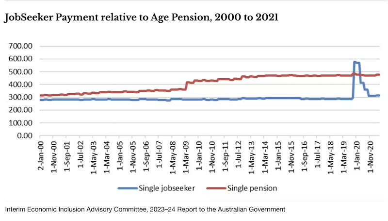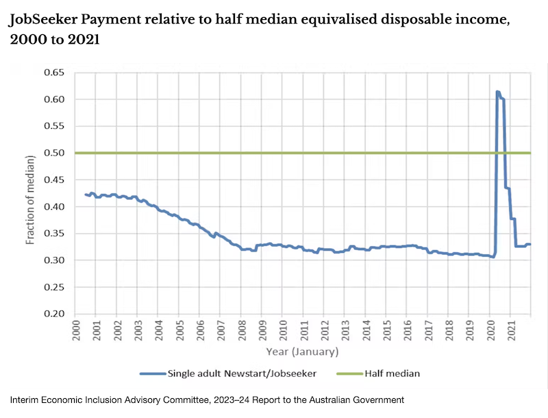 Apart from a temporary boost during the COVID-19 pandemic, the payment (previously known as the NewStart Allowance) has declined relative to median incomes and other welfare payments for several decades.