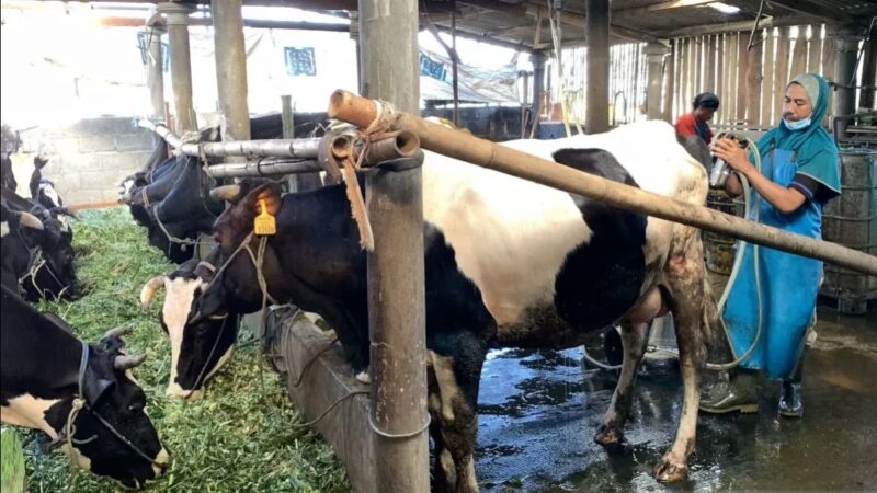 The yields of Friesians and other European breeds used to mild weather drop in the tropics. Statistics Indonesia reports domestic milk production is less than a million tonnes a year from 585,000 cows.