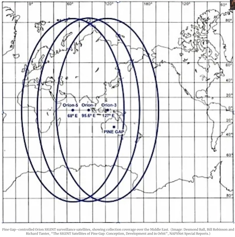 Two large Orion geosynchronous signals intelligence satellites, belonging to the US and operated from Pine Gap, are located 36,000 kms above the equator over the Indian Ocean. From there, they look down on the Middle East, Europe, and Africa, and gather huge amounts of intelligence data to beam back to the Pine Gap base.