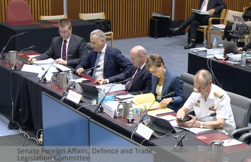 The best and the brightest from the Defence portfolio assume familiar postures as they attempt to respond to questions from Greens Senator David Shoebridge in Senate Estimates, the Senate Foreign Affairs, Defence and Trade Legislation Committee meeting, on 13 March 2025. Democratic accountability at its finest. (Photo: Australian Parliamentary Services, YouTube.)