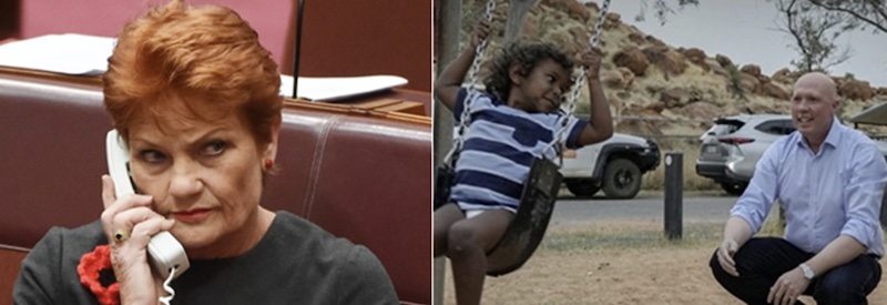 “I’m not a racist, but …” Observers say variations of this phrase, uttered regularly over the years by Pauline Hanson (above left) were a stumbling block to a ‘Yes’ vote, skilfully exploited by Peter Dutton (right). Image: ABC, News Corp.