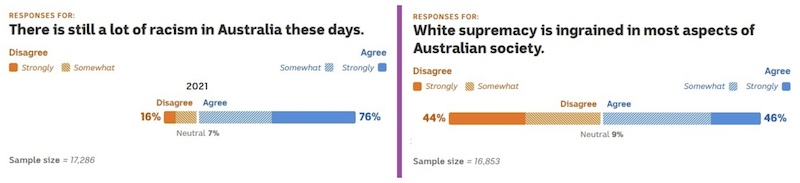 Land of contrasts: 76 per cent of respondents to a survey for the ABC agreed there’s a lot or racism in Australia these days, but just 46 per cent said white supremacy is ingrained here. Images: ABC.