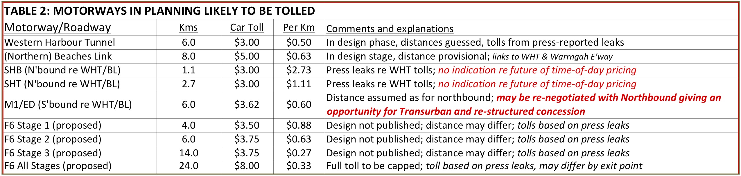 The first table shows the present tolling arrangements as at January, 2018. The second table shows likely future tolling based on analysis of financing demands and the business case. The third table is more speculative, showing which Sydney roads may end up also being subject to tolls.