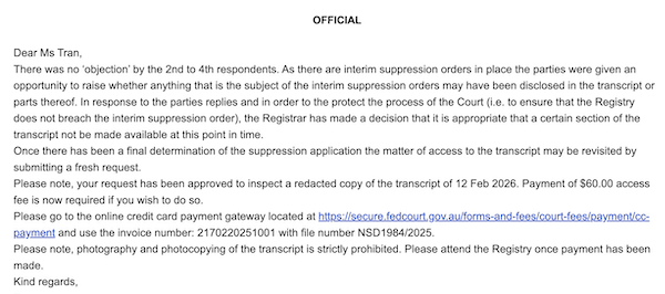 “In response to the parties’ replies and in order to protect the process of the Court (i.e. to ensure that the Registry does not breach the interim suppression order), the Registrar has made a decision that it is appropriate that a certain section of the transcript not be made available at this point in time,” the email stated.