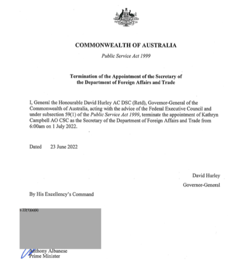 And so it comes as no real surprise that he signed paperwork on June 21 last year to terminate Campbell as the Secretary of Foreign Affairs and Trade.