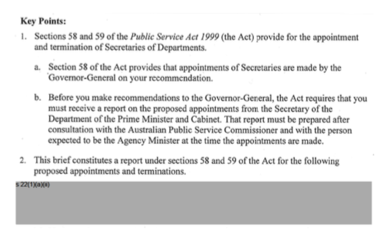 He signed off on the termination of three Secretaries that day: David Fredericks, an elder statesman of the bureaucracy, was terminated as the Secretary of Industry, Science, Energy and Resources so that he could take up a new role as Secretary of Climate Change, Energy, the Environment & Water.
